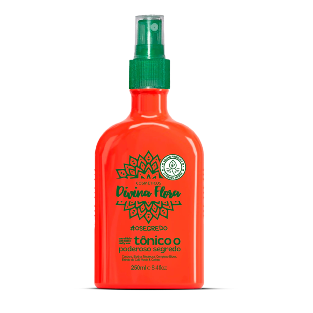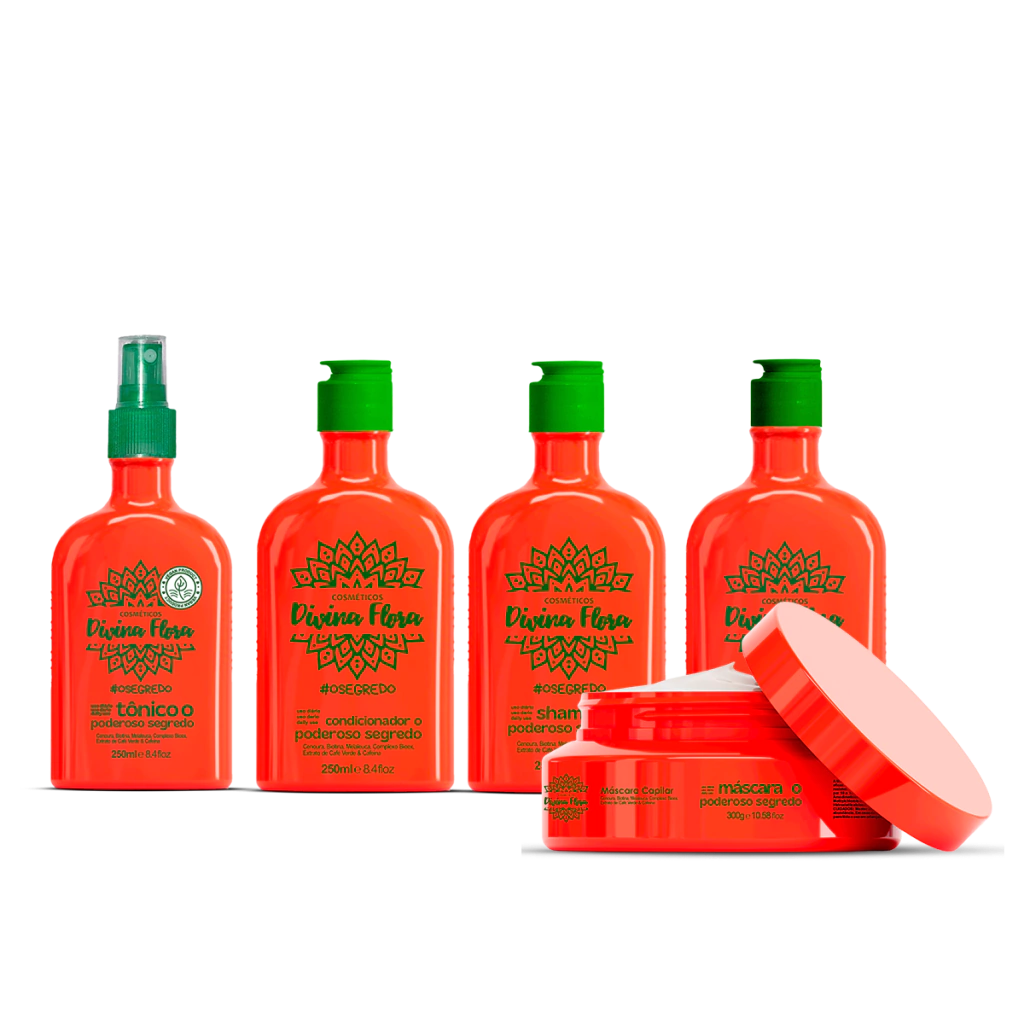Transforme seus cabelos com o Kit Poderoso Segredo Divina Flora, que inclui shampoo, condicionador, máscara e tônico. Este conjunto é a solução ideal para quem busca cabelos saudáveis, hidratados e cheios de brilho.
